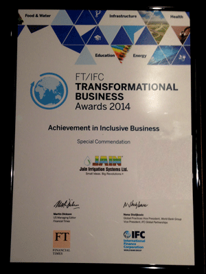 Jain Irrigation has won Special Commendation for "Achievement in Inclusive Business" at the FT/IFC Tranformational Business Awards 2014.