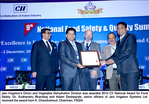 Mumbai, December 5, 2014Jalgaon based Jain Irrigation Systems’ Onion and Vegetable Dehydration Division has bagged the 2014 CII National Award for Food Safety. The award was presented in Delhi by K. Chandramouli, Chairman of The Food Safety and Standards Authority of India (FSSAI) to Dr. Sudhanshu Bhardwaj and Aslam Deshpande, senior officers of Jain Irrigation Systems Ltd. at the 9th National Food Safety and Quality Summit organised by Confederation of Indian Industry (CII) in New Delhi.