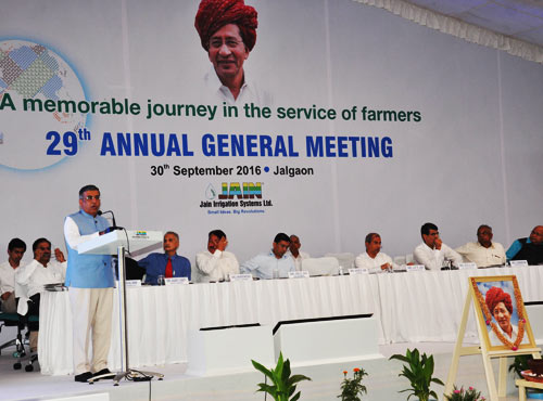 30th Sep 2016, Jalgaon. The ideals laid down by Founder Bhavarlalji Jain of not making any adjustments to the ethical principles, hard work and honesty for the long term sustainable success, has taken Jain Irrigation from the capital of Rs 7000 to the turnover of Rs 6400 crores. Jain Irrigation will be able to overcome all challenges, Jain Irrigation Systems Ltd. Chairman Ashok Jain said while expressing tremendous confidence by following the path laid by Founder Bhavarlal Jain at 29th Annual General Meeting (AGM) of Jain Irrigation Systems Ltd which was held at JISL Plastic Park under the chairmanship of Ashok Jain. This was the first AGM held after passing away of late Founder Chairman Bhavarlal Jain. The Senior member of Jain Family Sevadas Dalubhau Jain, Director Vasant Warty, Dr H. P. Singh, and Ghanshyam Dass recalled fond memories of Founder Chairman Late Bhavarlalji (Bhau) Jain. Shareholders of Jain Irrigation, company associates, students of Anubhuti School and Raisoni Management Science College were present for the AGM.