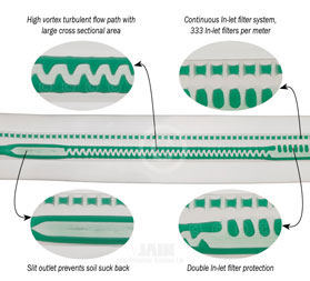 • मध्यवर्ती आउटलेट, टेप के अन्दर पानी का प्रवाह रोकते हुए, पानी की प्रत्येक बूंद मिट्टी में गिरे यह सुनिश्चित करते है।.